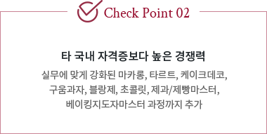 ÆÛ½ºÆ®Á¦°úÁ¦»§ÇпøÀº Á¦°úÁ¦»§»ê¾÷ÀÇ Æ®·»µå¿¡ ¸ÂÃç ¼ÒºñÀÚÀÇ ¡®°¡½Éºñ¡¯¸¦ »ç·ÎÀâ´Â ÇÁ¸®¹Ì¾ö µðÀúÆ® ¹®È¸¦ À̲ø¾î°¡´Â ÁÖ°üÇÏ´Â ÀÚ°ÝÁõ ½ÃÇèÀÎ º£ÀÌÅ·Áöµµ¸¶½ºÅÍ, Á¦°ú¸¶½ºÅÍ, Á¦»§¸¶½ºÅÍ, ±¸¿ò°úÀÚ¸¶½ºÅÍ, Ÿ¸£Æ®¸¶½ºÅÍ, ºí¶ûÁ¦¸¶½ºÅÍ, ¸¶Ä«·Õ¸¶½ºÅÍ, ÄÉÀÌÅ©µðÀÚÀθ¶½ºÅÍ, ÃÊÄݸ´µðÀÚÀθ¶½ºÅÍ·Î ¼³°èµÈ 9°¡Áö ÇÁ·Î±×·¥À» ÅëÇØ °í°´ÀÇ ´ÏÁî¿Í ¸¸Á·À» ÇÙ½ÉÀ¸·Î µÐ ÃÖ°íÀÇ ÆÄƼ½Ã¿¡ ¾ç¼ºÀ» ¸ñÇ¥·Î ±³À°ÇÕ´Ï´Ù.